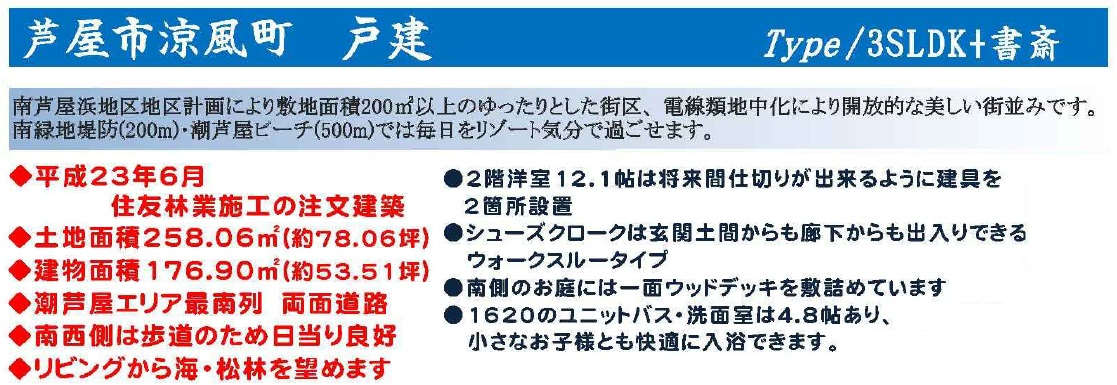 ◆潮芦屋エリア最南列に位置します/3SLDK+書斎の間取りです/リビングから海・松林を望めます/LDKは約22.5帖あり/南側のお庭は一面ウッドデッキ敷きです/2階洋室12.1帖は将来間仕切りが出来るように建具を2ヶ所設置/シューズクロークは玄関土間からも廊下からも出入り出来るウォークスルータイプ/お風呂は1620サイズ/洗面室は約4.8帖あり小さなお子様とも快適に入浴出来ます