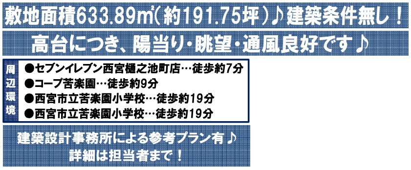 学区 | 小学校区:苦楽園小学校 1,100m 中学校区:苦楽園中学校 1,400m |