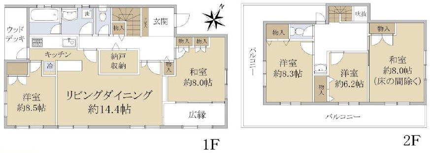 ◆建物面積約52.45坪の5LDK+納戸で2階の3面にバルコニーあり
