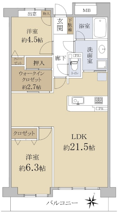 ◆LDKは約21.5帖あり/全室に窓と収納あり/LDKにウォークインクローゼット約2.7帖あり