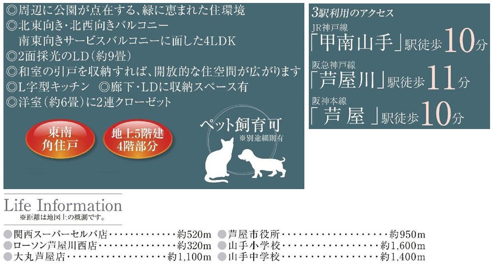 ◆JR「芦屋駅」徒歩10分・「甲南山手駅」徒歩8分/阪急「芦屋川駅」徒歩11分/阪神「芦屋駅」徒歩10分