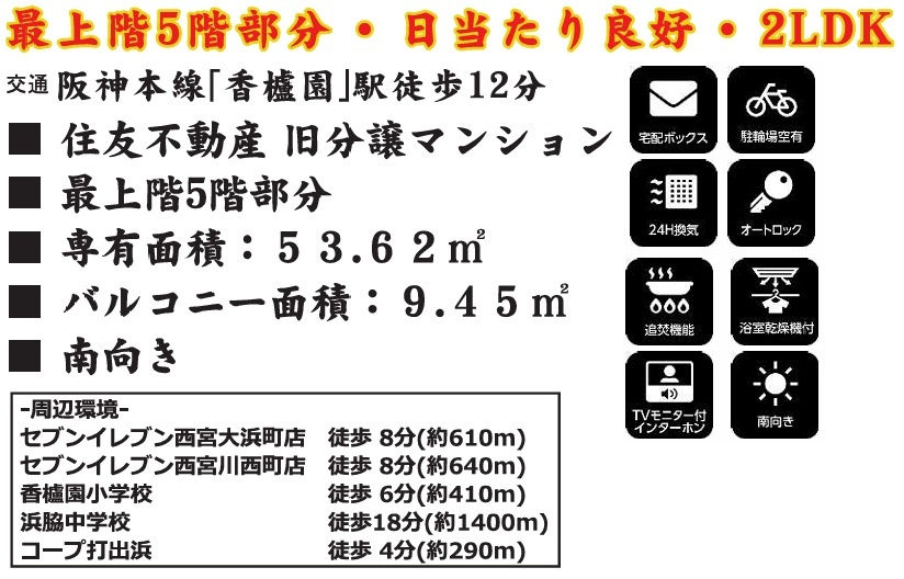 | 交通 | 阪神本線 香櫨園駅まで 徒歩11分 JR東海道線 さくら夙川駅まで 徒歩19分 |