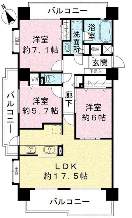 ◆LDKは約17.5帖あり/キッチンに勝手口あり/全居室に収納あり/浴室に窓あり/南側と西側と北側の3カ所にバルコニーあり