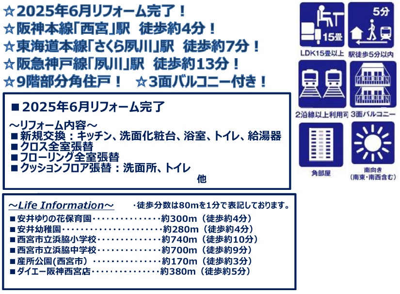 ◆阪神「西宮駅」徒歩4分/JR「さくら夙川駅」徒歩7分/阪急「夙川駅」徒歩15分