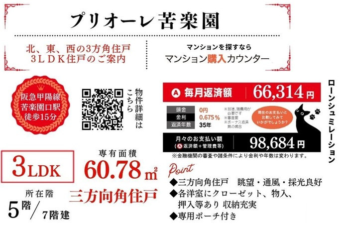 学区 | 小学校区:北夙川小学校 1,040m 中学校区:苦楽園中学校 1,920m |