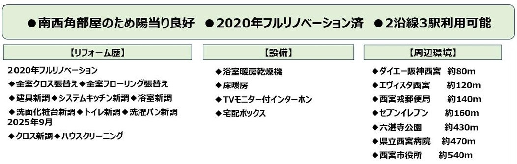 ◆2020年フルリノベーション:システムキッチン交換/ユニットバス交換/洗面化粧台交換/防水パン交換/トイレ交換(温水洗浄便座付)/建具交換/フローリング張替/クロス張替/CF張替/ハウスクリーニング/等 2025年9月一部リフォーム:クロス貼替/ハウスクリーニング