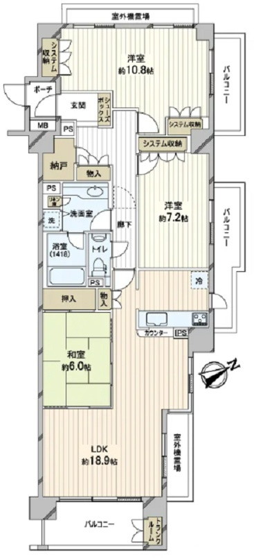 ◆LDKは約18.9帖あり/対面式カウンターキッチン/洋室約10.8帖は分割して2部屋に変更可(要実費)(4LDKになります)/1418サイズの浴室は追炊機能と浴室暖房乾燥機付/玄関前に門扉付の専用ポーチ1.65㎡あり/バルコニーは南東側1カ所と北東側に2カ所あり/バルコニーにトランクルーム0.80㎡付