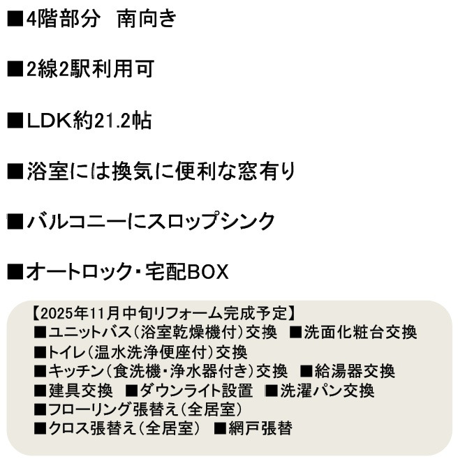 駐車場、南向き、陽当たり良好、眺望あり、リフォーム済、駅近物件(徒歩5分以内)、2沿線利用可
