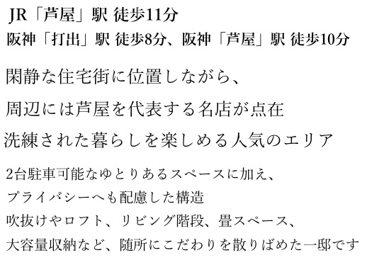 交通 | JR東海道線 JR芦屋駅まで 徒歩11分 阪神本線 打出駅まで 徒歩8分 阪神本線 阪神芦屋駅まで 徒歩10分 |