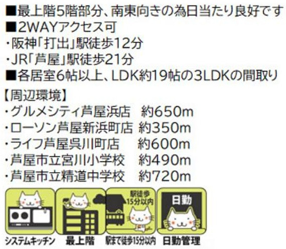 交通 | 阪神本線 打出駅まで 徒歩11分 JR東海道線 JR芦屋駅まで 徒歩20分 |