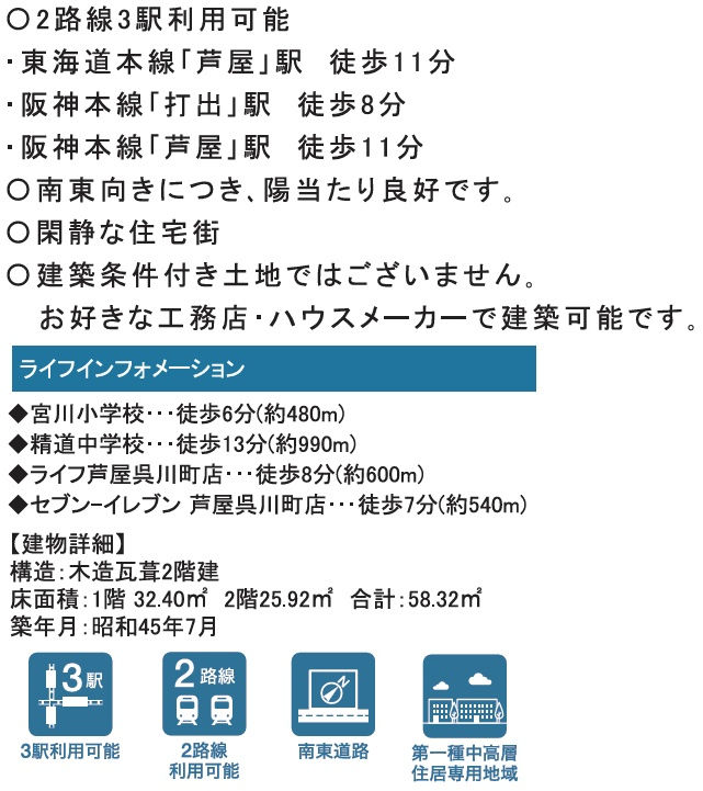 交通 | JR東海道線 JR芦屋駅まで 徒歩11分 阪神本線 打出駅まで 徒歩8分 阪神本線 阪神芦屋駅まで 徒歩11分 |