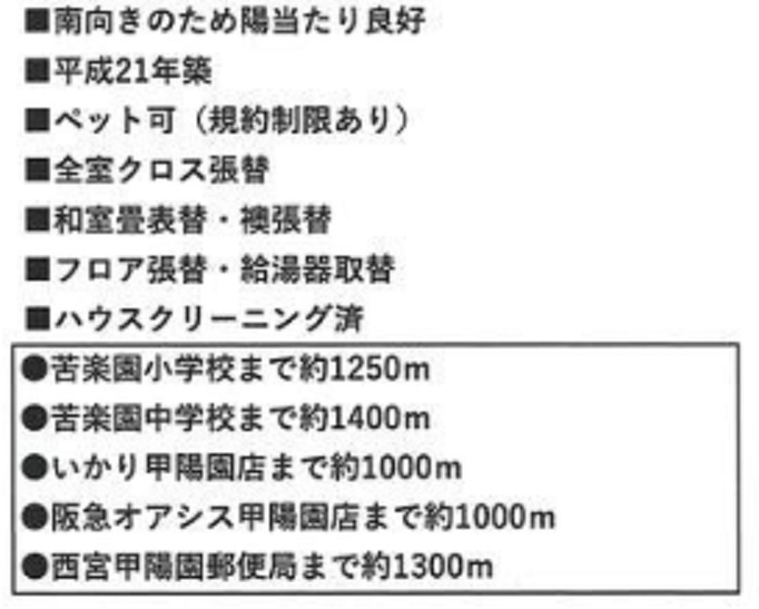 学区 | 小学校区:苦楽園小学校 1,400m 中学校区:苦楽園中学校 1,500m |