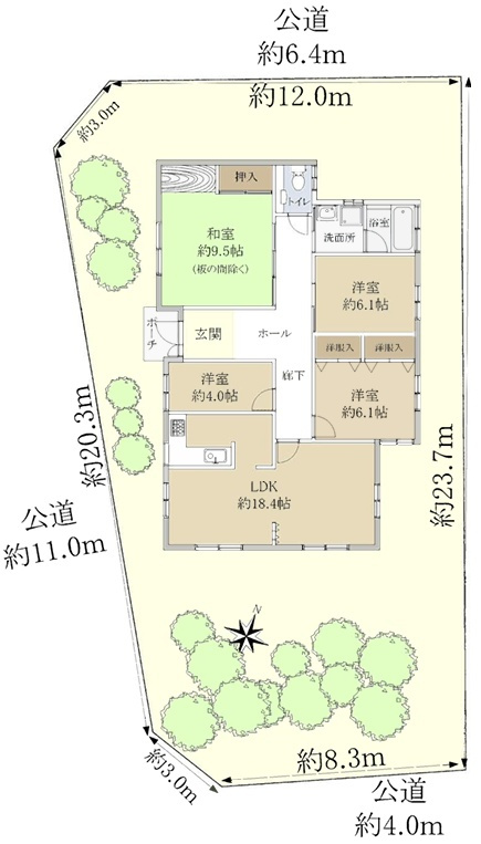 接道 | 南東 4m(幅員) 公道 南西 11m(幅員) 私道 北西 6.4m(幅員) 公道 |