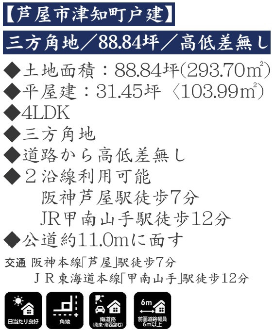 交通 | 阪神本線 阪神芦屋駅まで 徒歩7分 JR東海道線 甲南山手駅まで 徒歩12分 阪急神戸線 芦屋川駅まで 徒歩15分 |