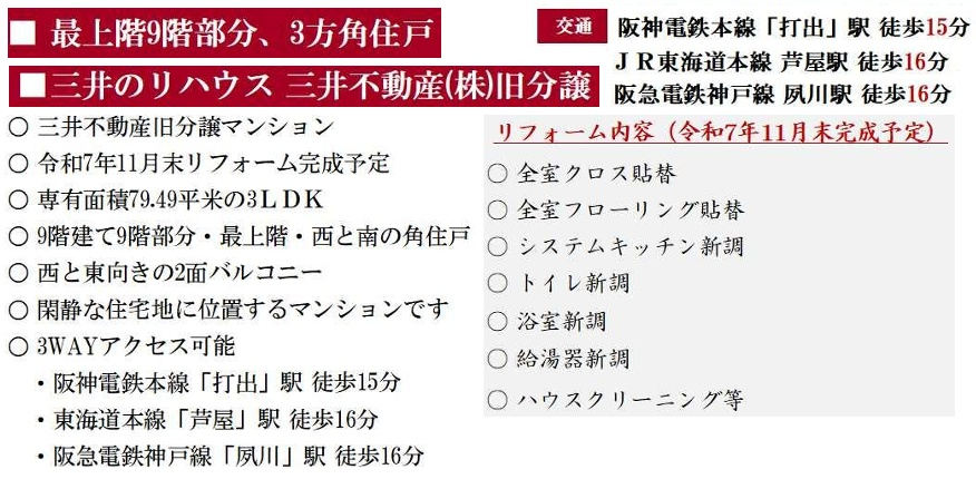 交通 | JR東海道線 JR芦屋駅まで 徒歩15分 阪急神戸線 夙川駅まで 徒歩15分 阪神本線 打出駅まで 徒歩14分 |