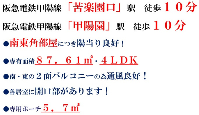 交通 | 阪急甲陽線 苦楽園口駅まで 徒歩10分 阪急甲陽線 甲陽園駅まで 徒歩10分 |