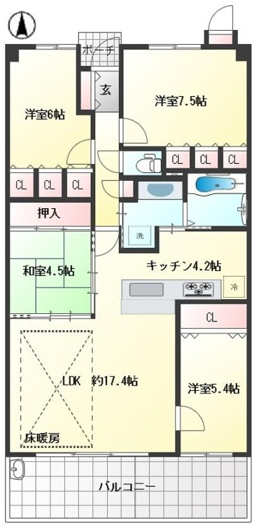 ◆LDKは約17.4帖あり/LDはガス温水式床暖房付/システムキッチンは浄水器付/各洋室に窓と収納あり/浴室は暖房乾燥機付/バリアフリー仕様/バルコニーにスロップシンクあり/玄関前にアルコーブあり
