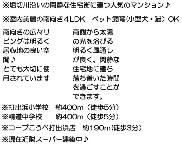 学区 | 小学校区:打出浜小学校 400m 中学校区:精道中学校 320m |