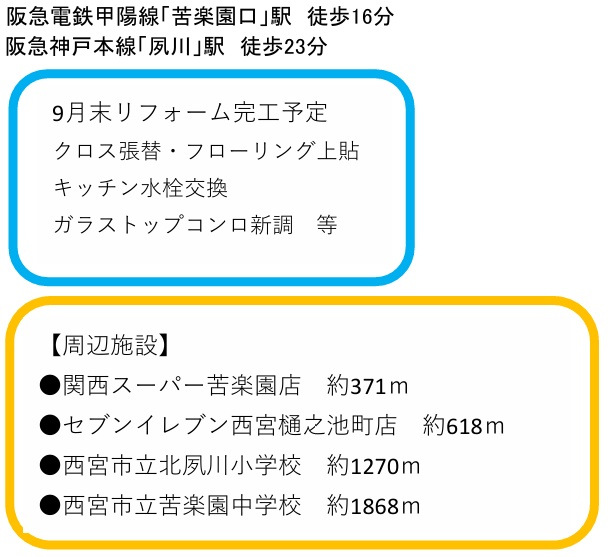 学区 | 小学校区:北夙川小学校 1,120m 中学校区:苦楽園中学校 1,680m |