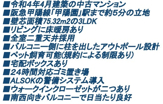 ◆LDKは約16.4帖あり/LDは床暖房付/全居室に窓と収納あり/アウトポール設計/全室二重天井採用/玄関前に門扉付の専用ポーチあり/ALSOKの警備システム採用/24時間対応ゴミ置き場/宅配ボックスあり
