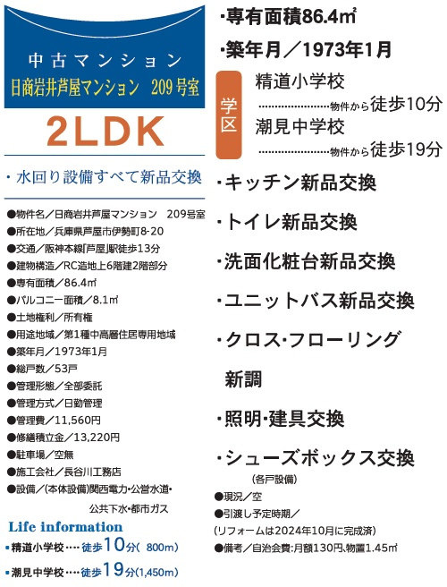 交通 | 阪神本線 阪神芦屋駅まで 徒歩12分 JR東海道線 JR芦屋駅まで 徒歩18分 JR東海道線 JR芦屋駅まで バス6分 停歩2分 |