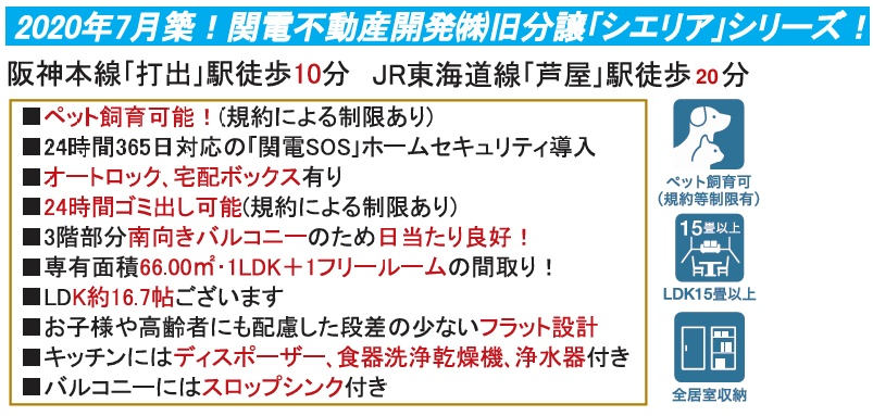 交通 | 阪神本線 打出駅まで 徒歩10分 JR東海道線 JR芦屋駅まで バス8分 停歩3分 JR東海道線 JR芦屋駅まで 徒歩24分 |
