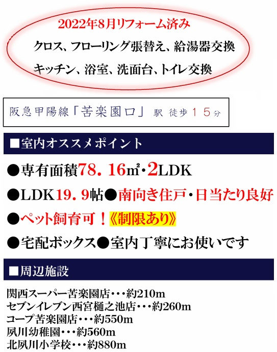 ◆関西スーパー・徒歩3分/樋之池公園・徒歩3分/コープ苦楽園・徒歩6分