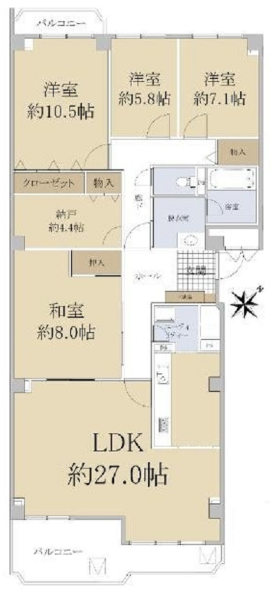 ◆LDKは約27.0帖あり/LDKと和室を合わせて利用可/キッチン横にユーティリティ(家事室)あり/全洋室に窓あり/廊下に納戸約4.4帖あり/南東側と北西側の両面にバルコニーあり/玄関前にトランクルームあり/オートロックあり