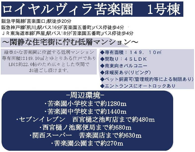 学区 | 小学校区:苦楽園小学校 1,700m 中学校区:苦楽園中学校 1,400m |