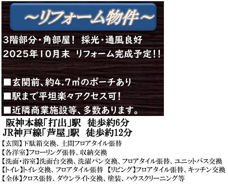 交通 | JR東海道線 JR芦屋駅まで 徒歩12分 阪神本線 打出駅まで 徒歩6分 |