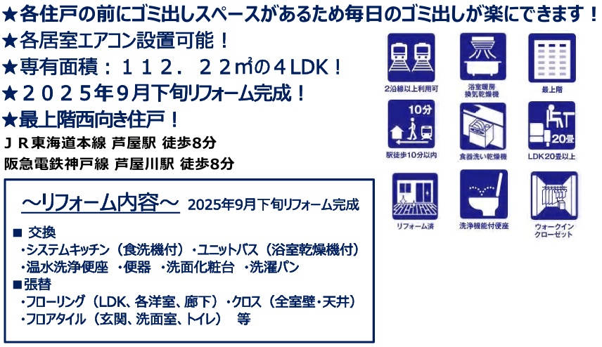 ◆2025年9月室内全面リフォーム済:システムキッチン交換(食洗機付)/ユニットバス交換(暖房乾燥機付)/洗面化粧台交換/トイレ交換(温水洗浄便座付)/建具交換/フローリング張替/クロス張替/CF張替/ハウスクリーニング/等