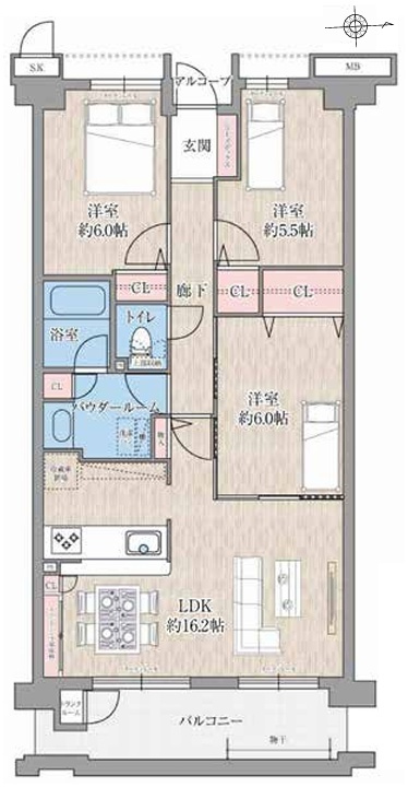 ◆LDKは約16.2帖あり/東側バルコニーの最大出幅約2mあり/バルコニーにトランクルームあり