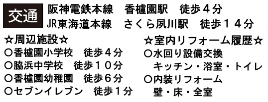 交通 | 阪神本線 香櫨園駅まで 徒歩2分 JR東海道線 さくら夙川駅まで 徒歩12分 阪急神戸線 夙川駅まで 徒歩16分 |