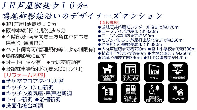 南向き、角部屋、陽当たり良好、ペット飼育可、リフォーム済、駐車場・空き有り、駅近物件(徒歩5分以内)、2沿線利用可