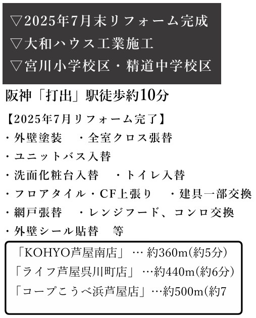 交通 | 阪神本線 打出駅まで 徒歩10分 JR東海道線 JR芦屋駅まで 徒歩19分 |