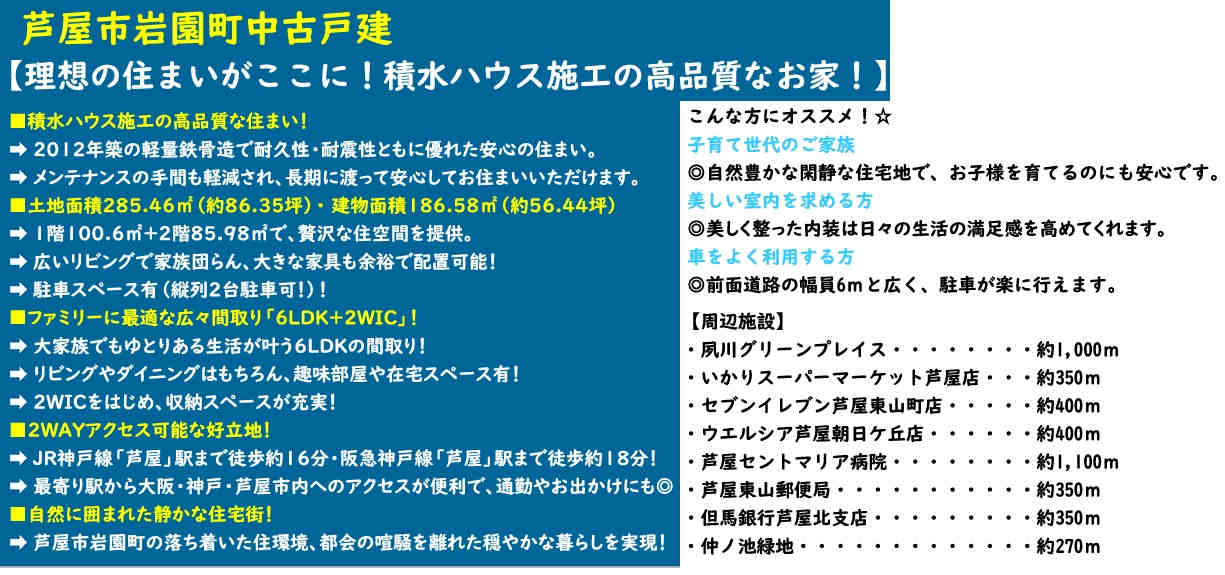 ◆JR「芦屋駅」徒歩17分/JR「芦屋駅」バス7分「岩園調」バス停まで徒歩3分/阪急「芦屋川駅」徒歩19分