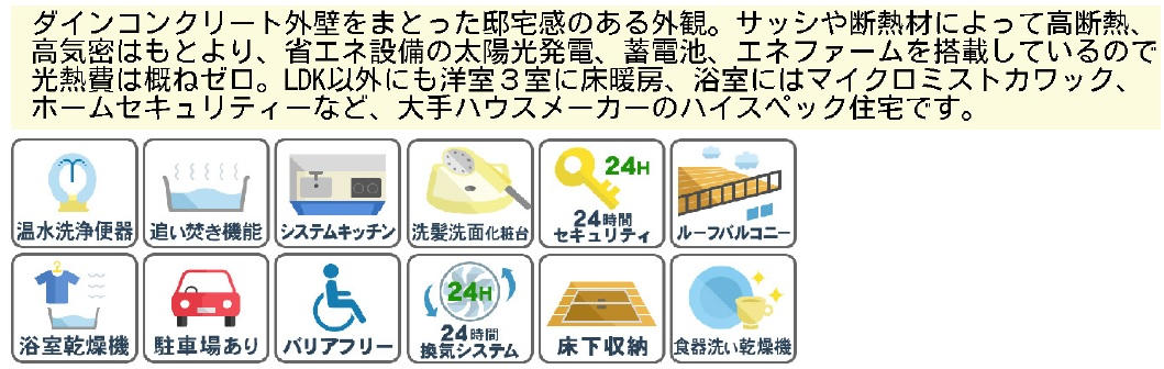 ◆LDKは約23.6帖あり/LDの南側にテラスあり/システムキッチンは食洗機付/LDKと洋室3室は床暖房付/浴室はマイクロミストカワック付/太陽光発電・蓄電池・エネファーム付