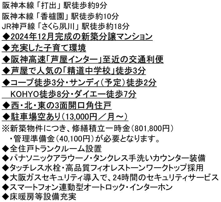 | 交通 | 阪神本線 打出駅まで 徒歩9分 阪神本線 香櫨園駅まで 徒歩10分 JR東海道線 さくら夙川駅まで 徒歩18分 |