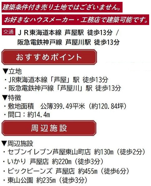 | 交通 | JR東海道線 JR芦屋駅まで 徒歩13分 阪急神戸線 芦屋川駅まで 徒歩13分 |