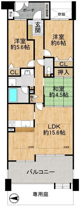◆LDKは約15.6帖あり/LDの2か所は床暖房付/バルコニーは出幅最大約3mあり/玄関前に門扉付の専用ポーチあり