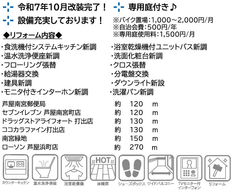 | 交通 | 阪神本線 打出駅まで 徒歩7分 JR東海道線 JR芦屋駅まで バス8分 停歩2分 |