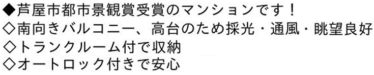 | 交通 | JR東海道線 JR芦屋駅まで バス10分 停歩1分 阪急神戸線 芦屋川駅まで バス8分 停歩1分 |