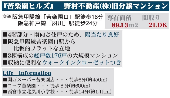 | 学区 | 小学校区:北夙川小学校 1,040m 中学校区:苦楽園中学校 1,920m |