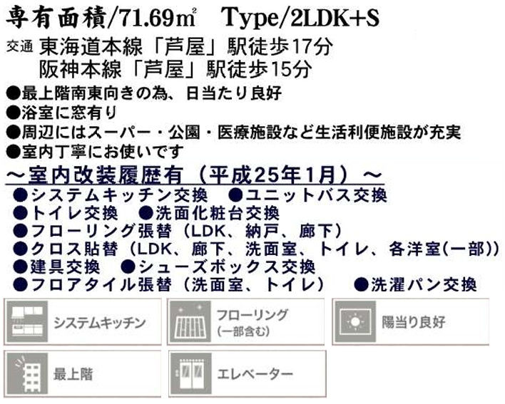 | 交通 | 阪神本線 阪神芦屋駅まで 徒歩15分 JR東海道線 JR芦屋駅まで 徒歩18分 JR東海道線 JR芦屋駅まで バス6分 停歩3分 |