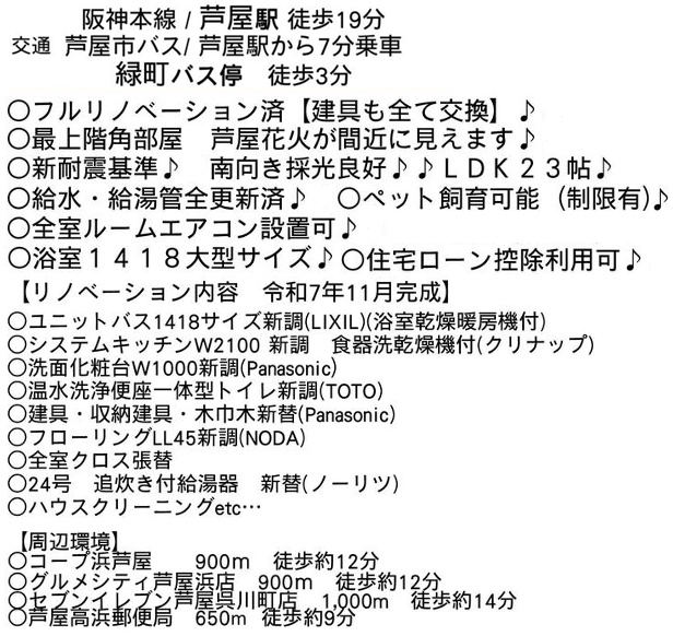 | 交通 | 阪神本線 阪神芦屋駅まで バス5分 停歩2分 阪神本線 阪神芦屋駅まで 徒歩16分 |