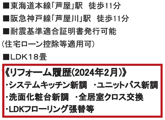 | 交通 | JR東海道線 JR芦屋駅まで 徒歩10分 阪急神戸線 芦屋川駅まで 徒歩10分 |