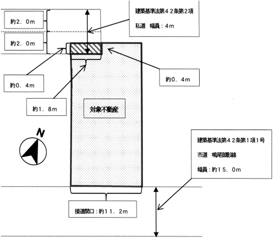 | 接道 | 南 15m(幅員) 公道 11.2m(接面) 北西 4m(幅員) 私道 1.8m(接面) |