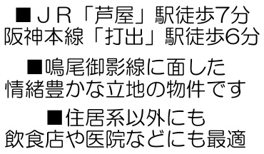 | 交通 | JR東海道線 JR芦屋駅まで 徒歩7分 阪神本線 打出駅まで 徒歩6分 阪神本線 阪神芦屋駅まで 徒歩9分 |