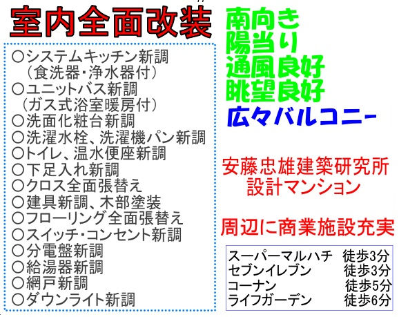 南向き、陽当たり良好、眺望有り、リフォーム済、駐車場・空き有り、3沿線利用可