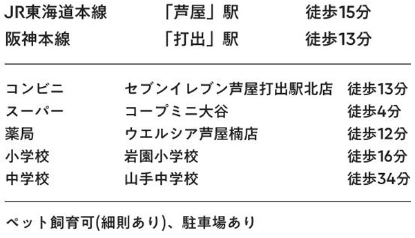 | 交通 | JR東海道線 JR芦屋駅まで 徒歩13分 阪急神戸線 夙川駅まで 徒歩15分 阪神本線 打出駅まで 徒歩12分 |